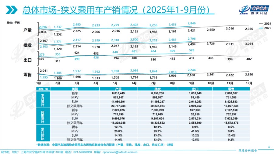根据统计局社会消费品零售数据和乘联会数据显示,中国汽车市场内卷竞争非常严重。2024年度汽车零售绝对金额同比下滑0.5%,但全年汽车国产狭义乘用车零售销量增长5%。截止到今年9月,中国汽车整体行业产销同比持续增长,但增长幅度非常有限。与此同时,2025年整体新能源汽车的渗透率预计还将突破55%。这意味着智能汽车的增长空间已经不太可能再度“翻倍”。