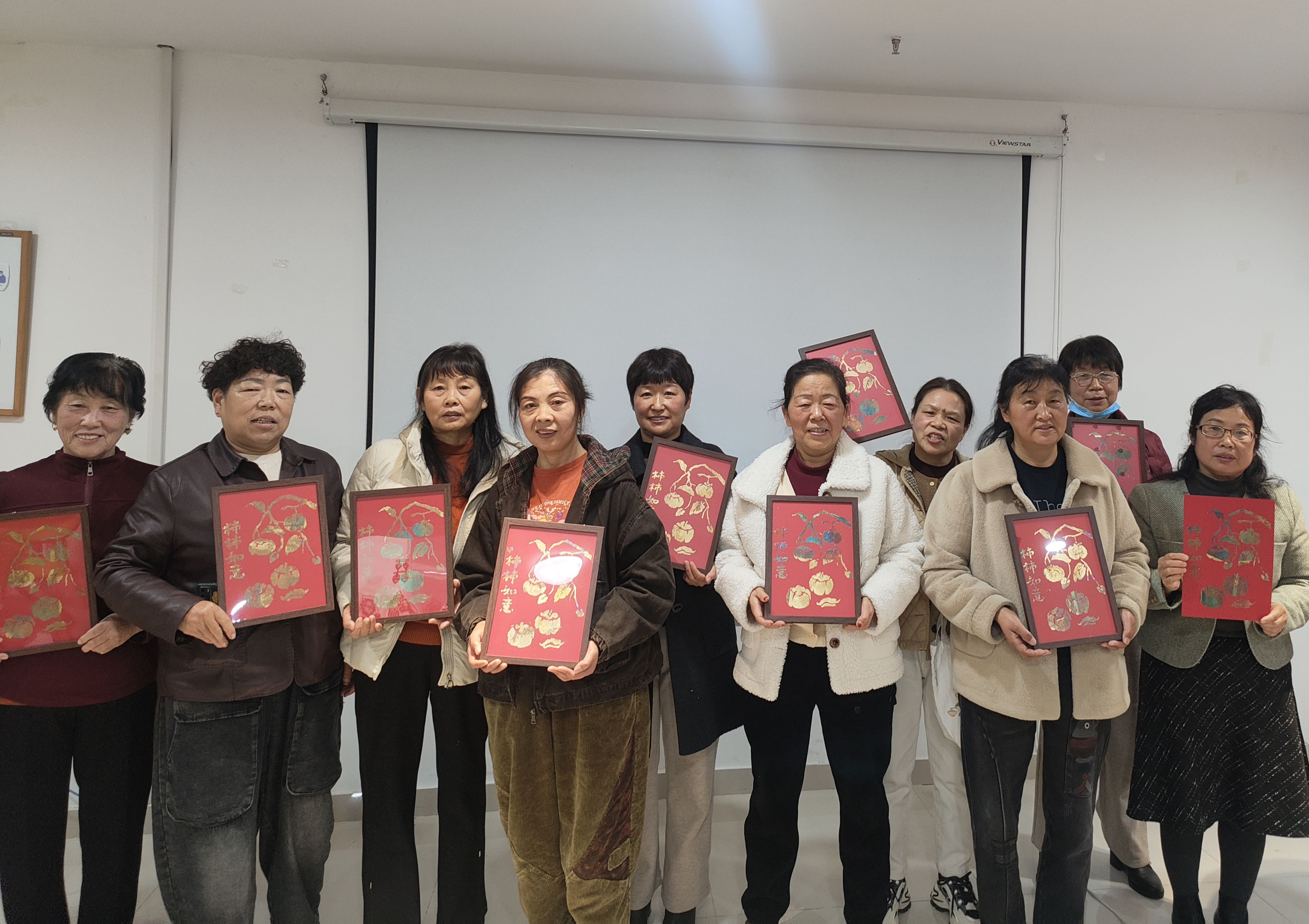 居民们从最初的生疏到逐渐熟练,在老师一对一的指导下,一幅幅“柿柿如意”烧箔画渐渐成型。金箔的光泽在灯光下熠熠生辉,柿子的轮廓灵动鲜活,“柿柿如意”的字样更是为作品添上了浓浓的祝福意味。