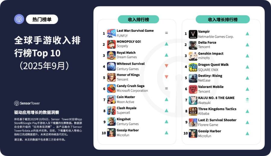 榜单头部被《LastWar:SurvivalGame》《MONOPOLYGO!》等产品占据,其中《LastWar》已连续三个月蝉联榜首,新兴游戏的崛起挤压了市场份额。