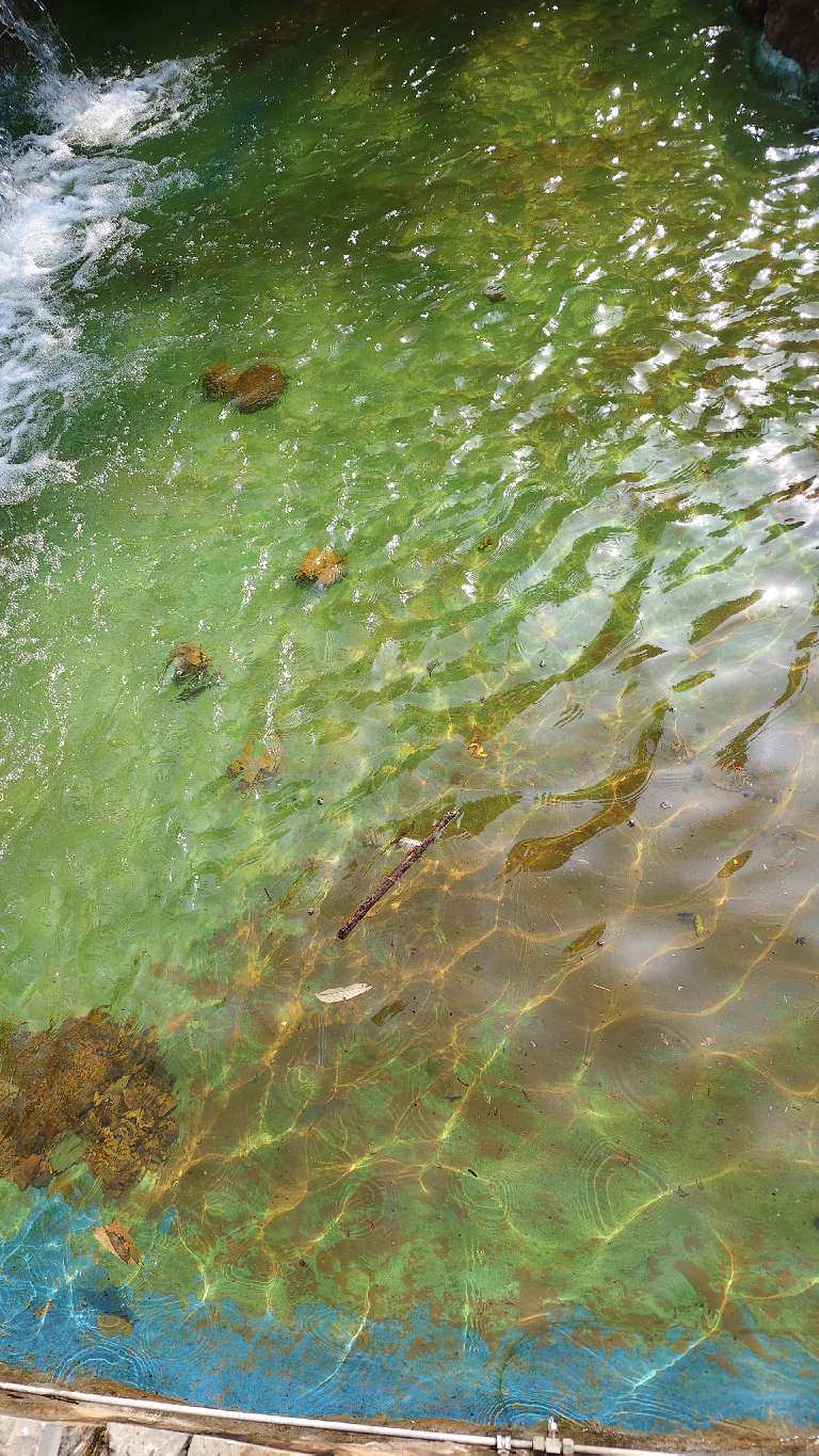 道路在山谷之中,旁边的流水就成了最美的柔情。五处台阶,水流缓缓,既有落差的美感,又有平缓的涟漪微波。渐渐的,水上多了层烟雾。梯田状的流水,有了水汽的加持,壁底的彩绘,在阳光的照射下,倒显得越加奇幻。石桥卧秋水,鱼游朽木飞。在这里走着,在这里停着。