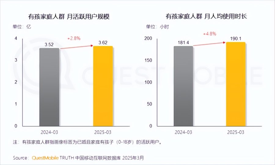 现下,有孩家庭已成为餐饮消费的重要力量。QuestMobile数据显示,截止2025年3月,有孩家庭人群月活跃用户规模已达3.62亿,月人均使用时长190小时,同比分别提升2.8%和4.8%;其中90后父母占比超45%,成为主力人群。
