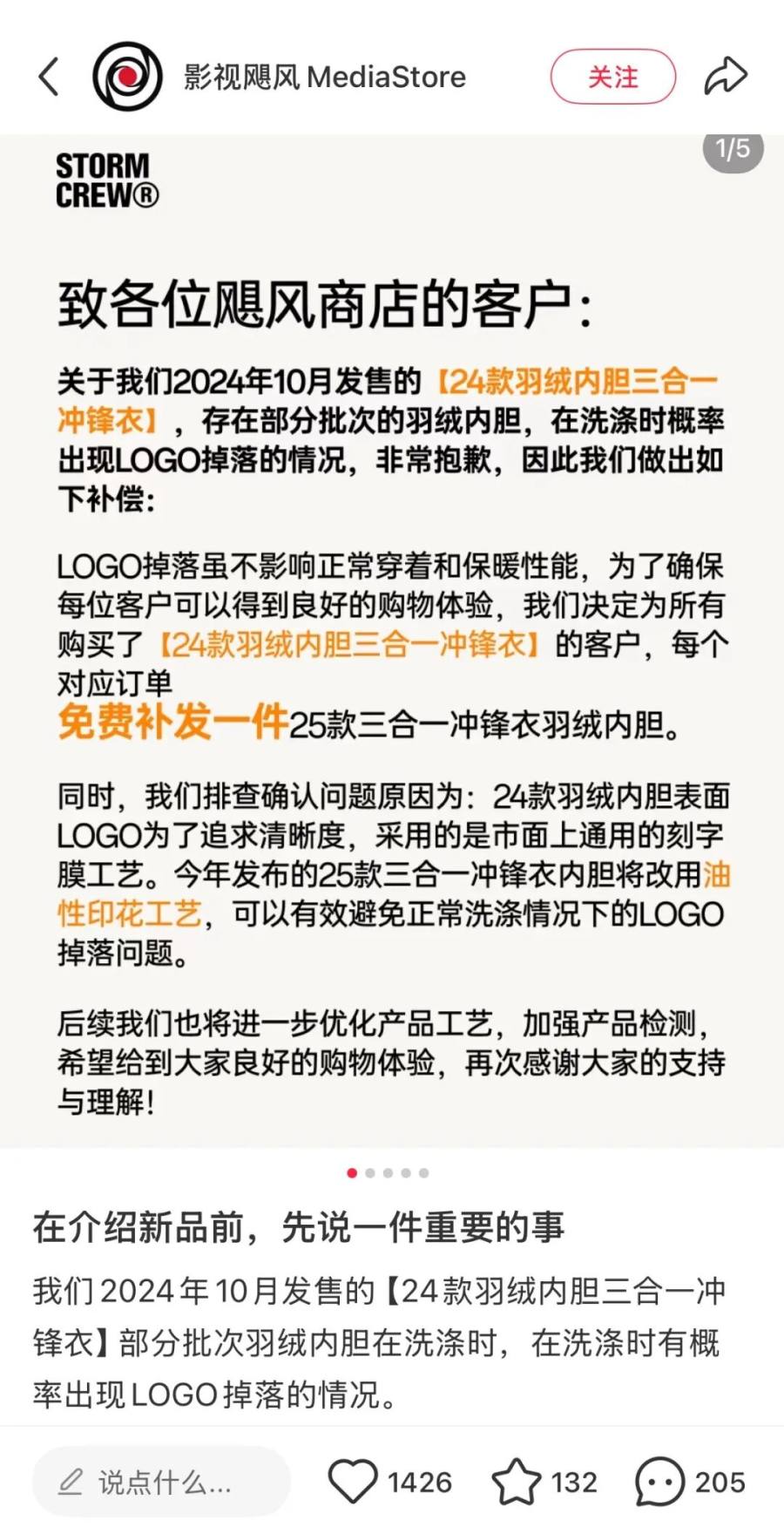 此前24年10月发售的冲锋衣羽绒内胆就出现过掉logo的情况,也被一些消费者避雷,但针对该问题官方明确承认产品问题并表态“为所有购买该产品的消费者免费补发一件新款羽绒内胆。”积极的态度和补偿动作,也顺势拉了一波好感。