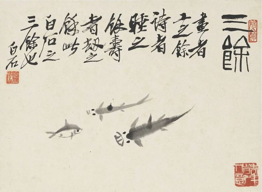 三家乃白石老人之艺术资粮,大半生进食消化,其衰年变法后,打通了古今,打通了自己与心外,以一种愈老愈简愈纯朴而成就了一代大师。