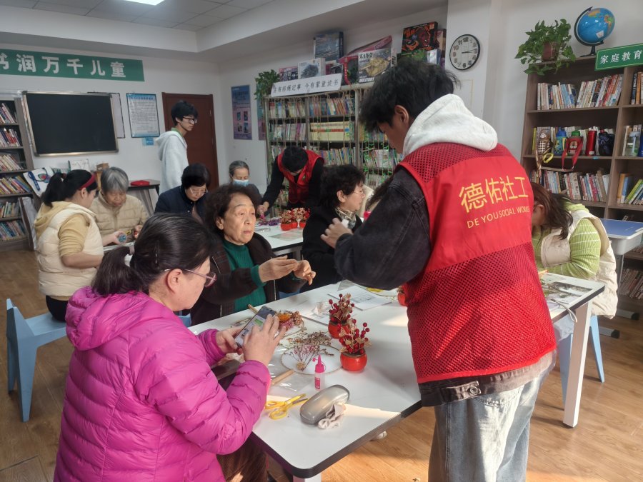 制作过程中,老人们有的仔细挑选干花,搭配出层次分明的花艺造型;有的小心翼翼涂抹酒精胶,将干花稳稳粘在宫扇上;遇到手法生疏的地方,便主动和身边同伴交流经验,或是向社工、志愿者求助。社工与志愿者们对动手不便的老人手把手协助调整花材位置、控制胶水用量,及时帮大家解决难题。活动尾声,老人们纷纷举起自己的作品,拉着同伴、社工合影留念,脸上洋溢着自豪与幸福的笑容。