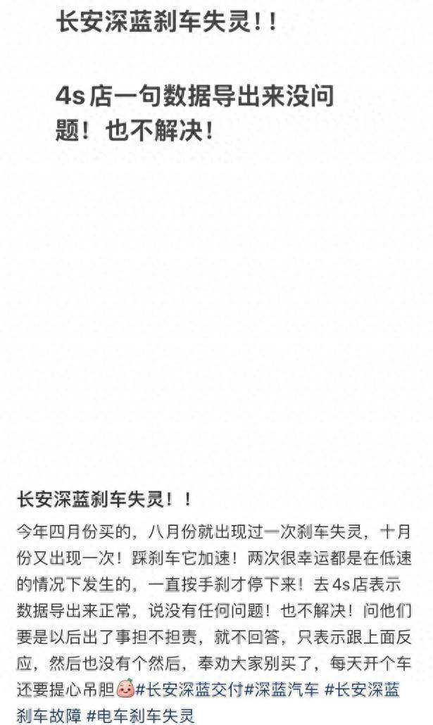 【文/深度评车&财经三剑客】近日,长安深蓝汽车深陷制动安全问题的舆论漩涡,多位车主的遭遇将这一品牌推向了风口浪尖,消费者对其产品质量和售后服务的质疑声此起彼伏。