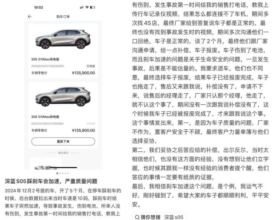 无独有偶,另一位深蓝S05车主也遭遇了类似的惊魂时刻。据凤凰网财经《公司研究院》报道,该车主2024年12月提车后,仅行驶了5个月,在停车踩刹车时,车辆突然加速,导致事故发生,电池受损。更令人气愤的是,事故发生后,车主试图上传行车记录仪视频以查明原因,却发现车机无法连接。多次向4S店和厂家反映,得到的答复却是“汽车正常”,视频数据也最终石沉大海,无从查证。