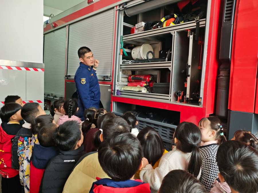 活动以“直观体验、互动学习”为核心,消防队员为孩子们量身设计了沉浸式参观路线。在消防车展示区,红色的车身、高耸的云梯与各类专业器材瞬间吸引了孩子们的目光,大家围着“消防战车”发出阵阵惊叹。消防员耐心讲解每种设备的用途,从破拆工具到救援绳索,用孩子易懂的语言科普专业知识;随后,在工作人员与老师的协助下,孩子们依次坐上消防车,亲身感受这份守护安全的荣耀,小脸上满是自豪。