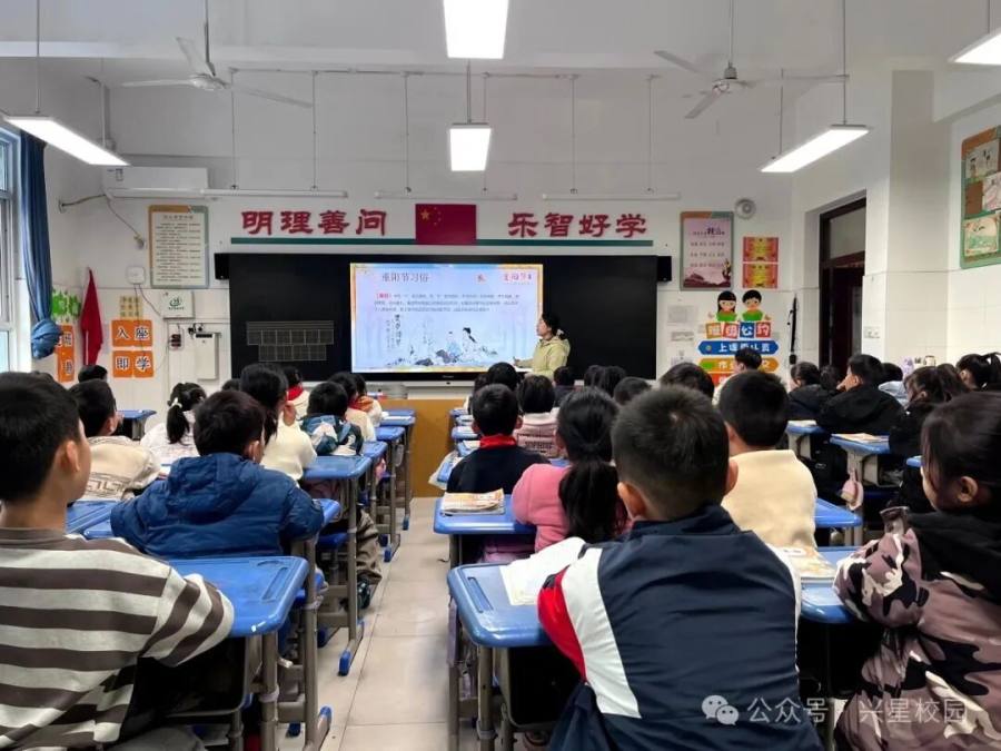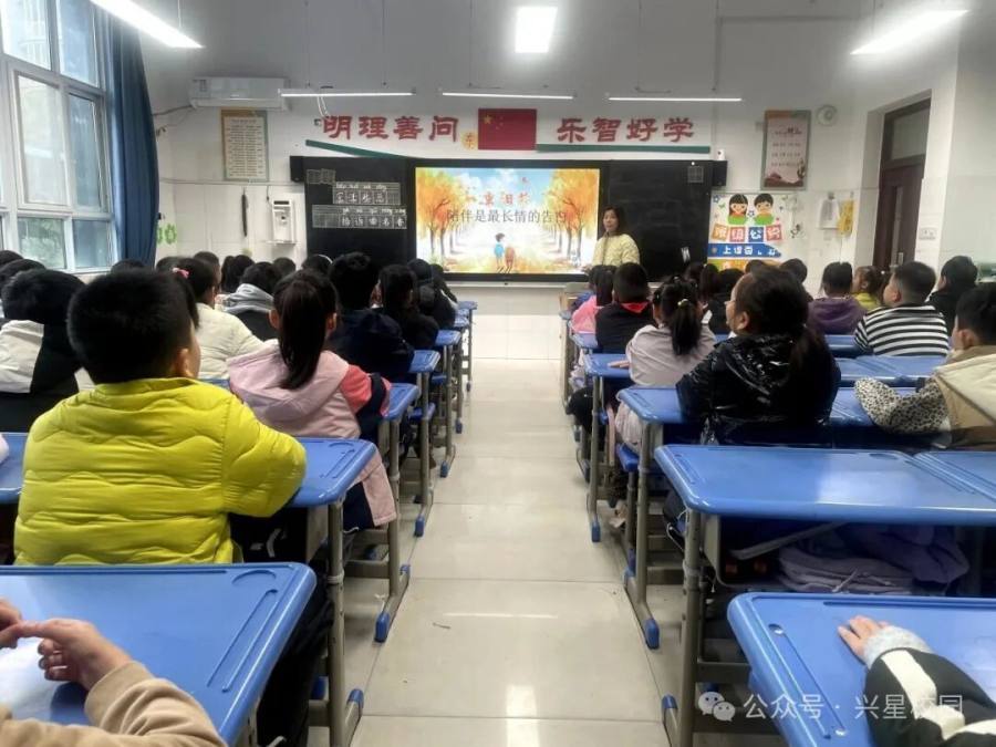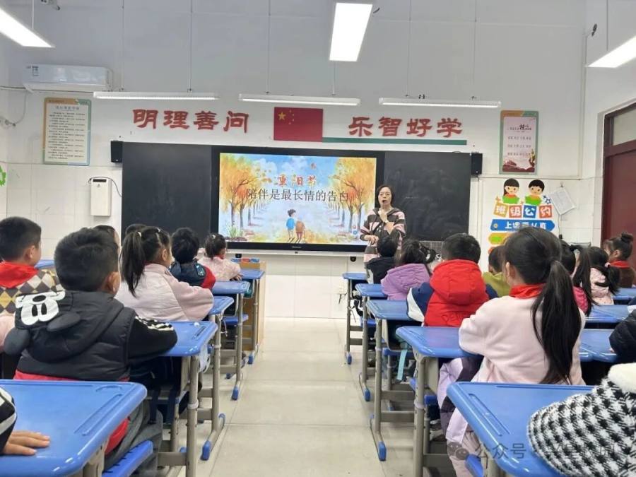 升旗结束后,各中队同步开展重阳节主题队会。课堂上,中队辅导员通过图文、短视频等形式,为少先队员讲解重阳节的起源、“登高、赏菊、插茱萸”的传统习俗,以及节日背后“感恩长辈、祈愿长寿”的文化内核;随后,大家围绕“如何用行动敬老”展开交流,从认知传统节日,到理解敬老美德的意义,让“尊重长辈”的观念深植心中。