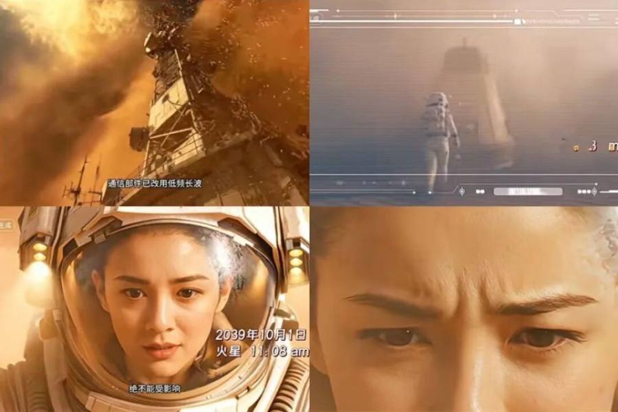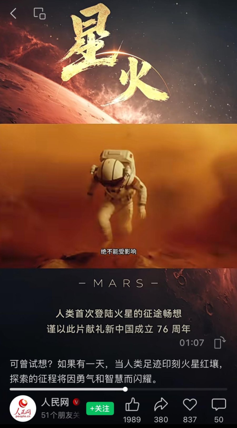 这是国庆节期间,人民网发布的一条名为《星火》的短片:2039年,人类首个火星基地建成当日,基地与地球视频直播的计划因沙暴突发导致信号中断,女宇航员小林在沙暴中冒着风险解决信号传输问题,让直播成功进行。