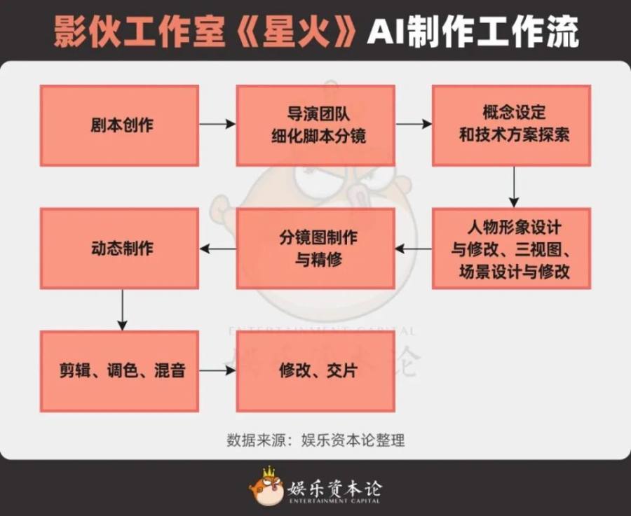 娱乐资本论了解到,影伙工作室的人员组成包括导演、编剧和视觉设计师等,4至5人的团队仅花2周就完成了《星火》,跑通了一整套AI视频生成工作流。