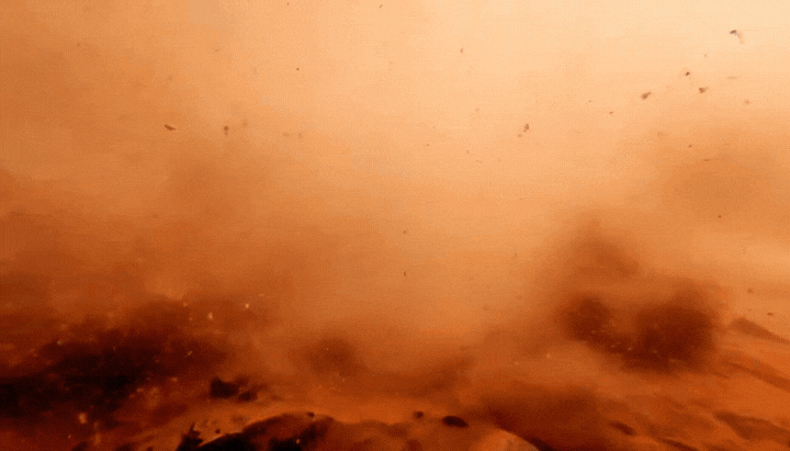 例如女主行走在沙暴中的镜头,技术团队先根据概念设定阶段生成的宇航服正面图作为垫图,生成出主体在沙尘暴肆虐的环境中艰难行走的图片,再利用AI技术将人物消除,生成一张空境场景,最后利用AI模型的首尾帧进行动态制作,输入相关动作的提示词,生成最终效果。
