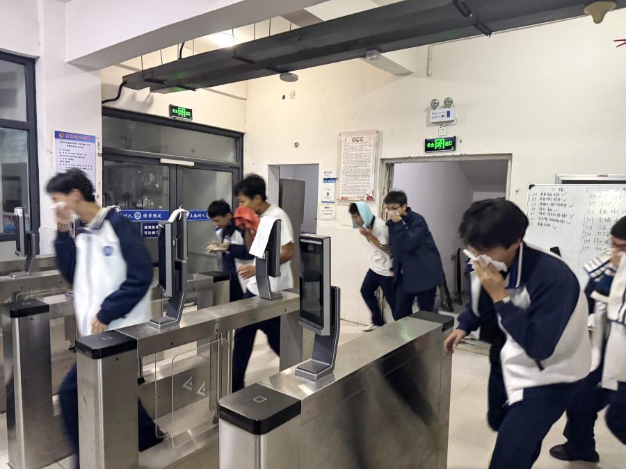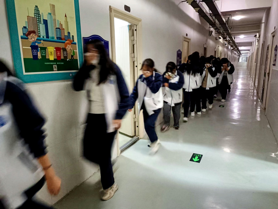 演练模拟学生宿舍楼突发火情,随着警报声响起,各楼层学生在班主任和生活老师的指挥下,迅速用湿毛巾捂住口鼻,弯腰低姿,沿指定疏散路线有序撤离至操场安全区域。师生们严格遵循 “靠右行走、不推不挤、快速撤离” 的原则,整个过程紧张而不慌乱。演练中,同学们将日常安全教育所学的消防逃生知识转化为实际行动,展现了良好的安全素养。