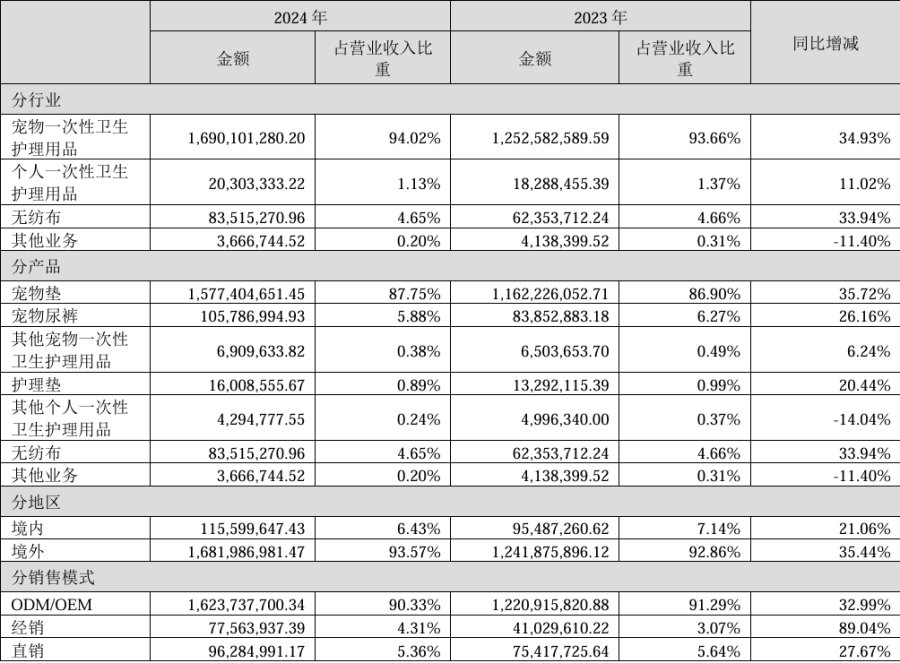 在业界看来,急于多元拓展的背后,是依依股份高度依赖境外业务的现状。依依股份主要经营一次性宠物卫生用品,产品包括宠物垫、宠物尿裤等。2024年财报显示,依依股份境外营收16.82亿元,在总营收中的占比接近94%