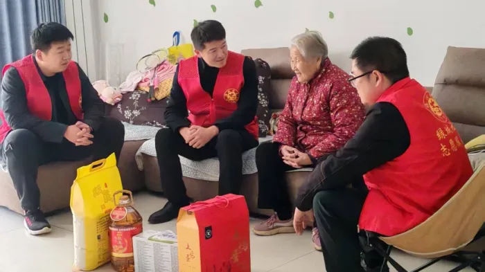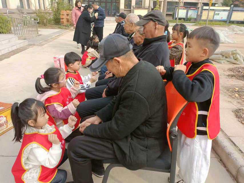 在姚寨村活动现场,老人们坐成一排,孩子们给老人们捶背,并给老人们带去新鲜的水果和面包;志愿者身穿红马甲走街串巷为老人们打扫院落,和老人们唠家常。