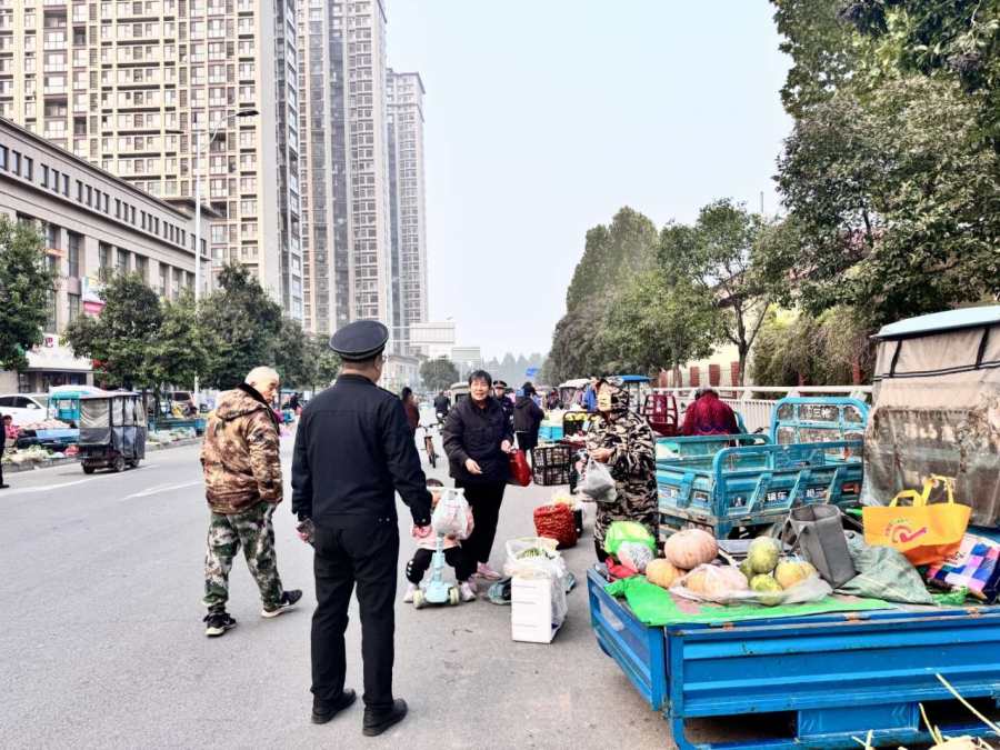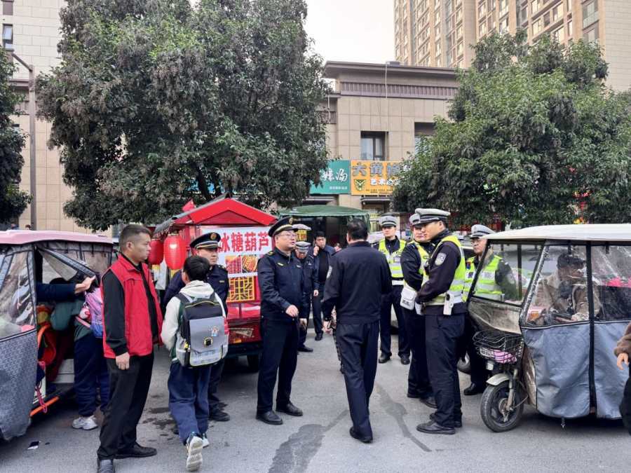 在商都路小学周边,恰逢学生放学高峰,联合执法队伍迅速形成“执法+交警”协同作战模式。大队十几名人员重点整治占道经营、流动摊贩、商户店外堆物等行为,对违规经营者现场宣讲《郑州市城市管理条例》,耐心引导其收拾摊位、规范经营;县交警大队十几名警力同步在校园周边主次干道开展交通疏导,对校门口违停车辆逐一劝离,有效缓解了以往放学时段“人车混行、拥堵难行”的状况,为师生出行筑牢安全屏障。