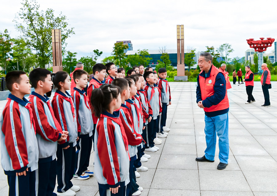10月23日,四川省南充市营山县关工委的老干部们牵手云凤实验小学的孩子,在营山白塔公园红军苑广场和百岁红军王定国展陈馆,举行了一场“老少携手进基地 红色故事我来讲”主题教育实践活动。