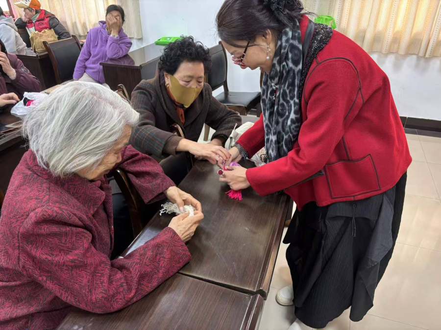 讲解结束后,老人们迫不及待地动手尝试。有的专注地绕着毛线,小心翼翼调整松紧;有的和身边伙伴探讨配色技巧,互相帮忙粘贴部件;还有的发挥创意,给小鸟加上了彩色的绒毛装饰。志愿者们穿梭在人群中,耐心解答疑问,手把手指导动作不太灵活的老人。“这个胶水要涂均匀,不然翅膀容易掉”“用黄色毛线做嘴巴会更显眼”,细致的指导让老人们快速掌握了技巧。