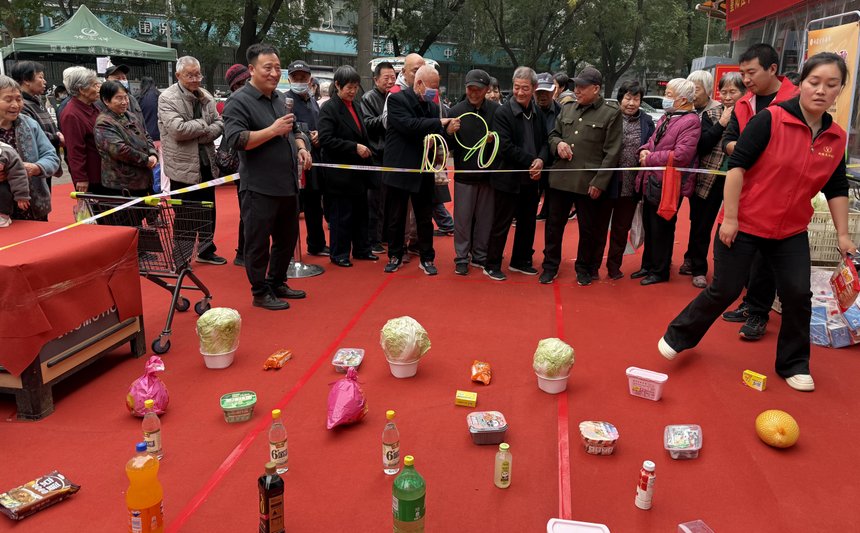 趣味套圈区则是现场最热闹的角落。爱心超市特意准备了饮料、调料、洗衣液等实用礼品作为套圈奖品,老人们摩拳擦掌,排着队轮流上阵。有的老人瞄准目标稳稳抛出圆环,精准套中奖品时,周围立刻响起阵阵喝彩;有的老人动作稍缓,旁边的志愿者便耐心指导技巧,偶尔的“空圈”也引来一阵善意的笑声。68岁的李爷爷成功套中一桶大瓶饮料,他高兴地说:“平时在家闷得慌,这个活动又好玩又有奖品,比在家看电视有意思多了!”