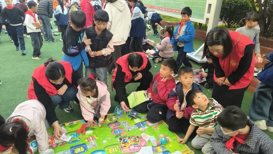 社区志愿者们身着红色马甲,全程参与活动。他们或蹲下身与小“掌柜”们交流,了解商品故事;或在摊位间穿梭,维护秩序,为活动保驾护航。在志愿者和老师的引导下,孩子们大胆推销、认真议价,在买卖过程中锻炼了沟通能力与财商思维。