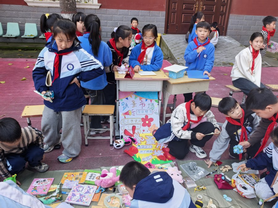 活动当天,青年路小学的操场上人头攒动。同学们化身“小掌柜”,精心布置摊位,“豆豆的杂货铺”“开心淘宝屋”等创意摊位名称格外吸睛。从闲置玩具、书籍到手工艺品,琳琅满目的商品摆满摊位,一元起的定价和限时折扣策略,瞬间点燃了大家的购物热情。