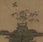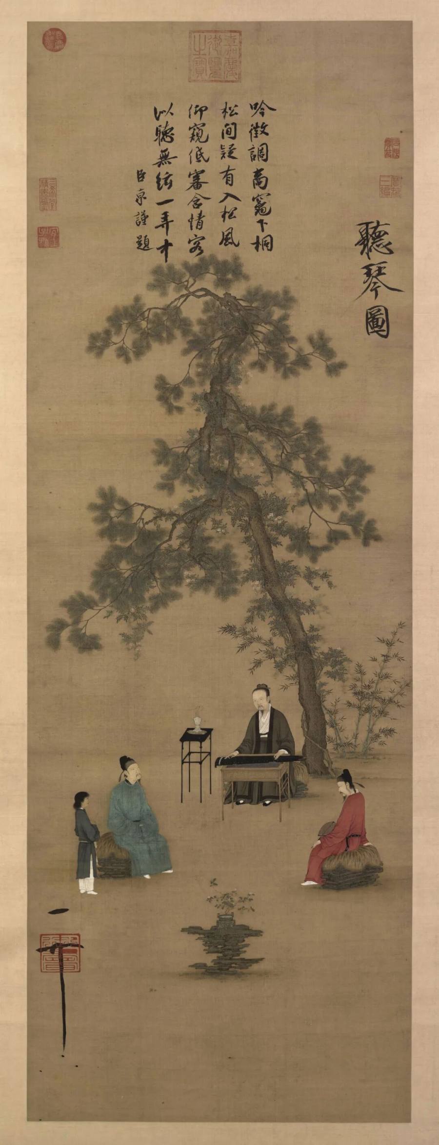 最绝的是它的构图,简单却满是节奏:上半部分松枝密,下半部分地面疏,是 “上密下疏”;左边有童子站着,是 “实” 的,右边听者旁边留着空,是 “虚” 的,又藏着 “左实右虚”。就这么一密一疏、一实一虚,松冠刚好压住空旷的地面,把你的注意力稳稳地拉回到一桌一琴、一炉一香上 —— 不想看别的,就想在这一方小天地里待着。