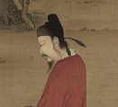 再看周围的人:左边站着个穿蓝衫的童子,双手抱在身前,眼神直勾勾盯着琴弦,连眼皮都不眨,好像生怕错过手指碰弦的那一刻;右边和前方,各有一位穿官服的听者,一个仰着脸、笼着袖子,下巴微微抬着,像是要接住飘上来的音;另一个低着头、手里捏着把扇子,指尖轻轻抵着扇面,仿佛在跟着心里的调子打节拍。三个人神态完全不一样,可身上的 “静” 是一样的 —— 连呼吸都像放轻了,怕扰了琴。