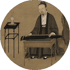 松树底下,一张几案摆得端正,案上的主人公正端坐抚琴。你看他的发髻,梳得整整齐齐,一根碎发都没有;衣纹线条清清楚楚,像被细心熨过,没有一丝褶皱。最妙的是他的手 —— 就停在琴弦上那一瞬间,不弹也不按,像在等一个最合适的节拍,连指尖的力道都看得见。琴案旁还放着一张小几,几上的香炉里,烟丝正一圈圈盘绕着往上飘,细细的、软软的,像为即将响起的琴声,搭了一条看不见的通道,要把声音往云里送。