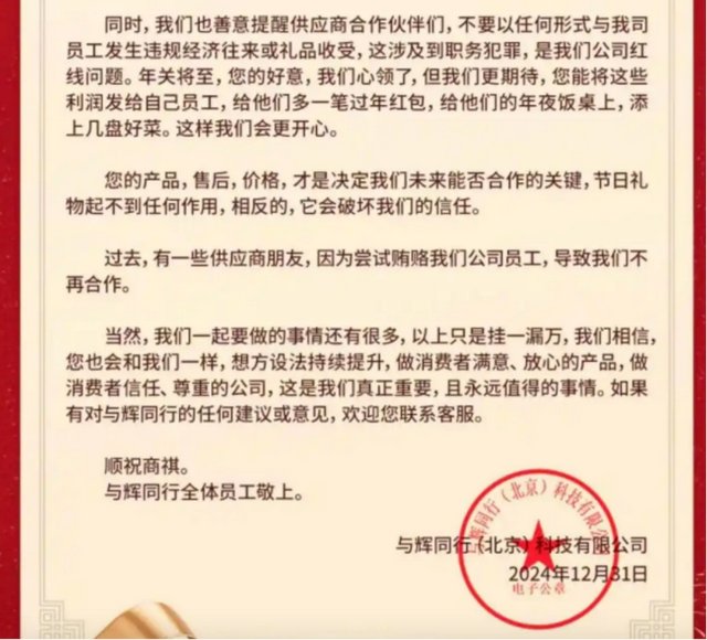 2024年末,董宇辉在写给供应商的一封信中,再次明确提醒商家:“不要以任何形式与我司员工发生违规经济往来或礼品收受,这涉及职务犯罪,是我们公司红线问题。”