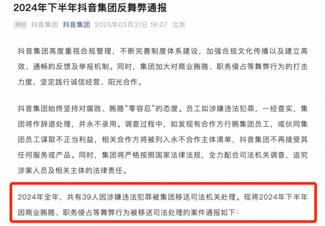 今年3月,抖音集团通报称,2024年共有39人涉嫌违法犯罪,被集团移送司法机关处理。其中,仅2024年下半年存在商业贿赂、职务侵占等舞弊行为的就有14人,涉及电商、生活服务等业务或部门员工。例如其中有电商前员工利用职务便利,为外部商家提供违规帮助,并收受好处费。