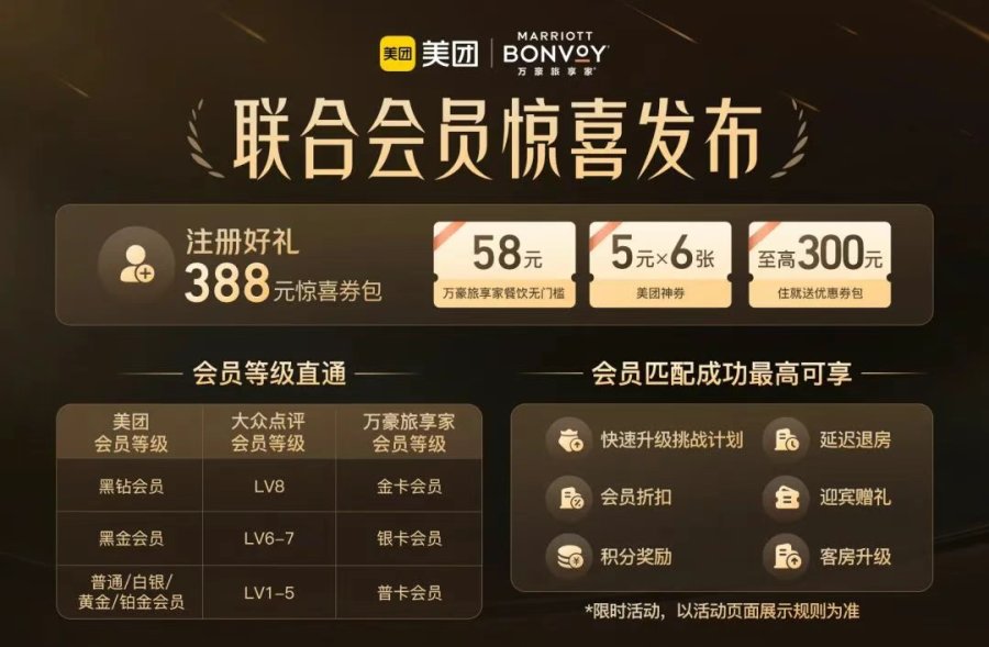 也正是因为联合会员的增值权益对用户产生的额外吸引力,在联合会员体系上线的24小时内,美团上万豪的预订量同比增长88%,其中,95后年轻用户的订单增幅超148%。美团黑钻、黑金会员领取万豪金卡、银卡会员的占比,达到当日会员总量的70%。