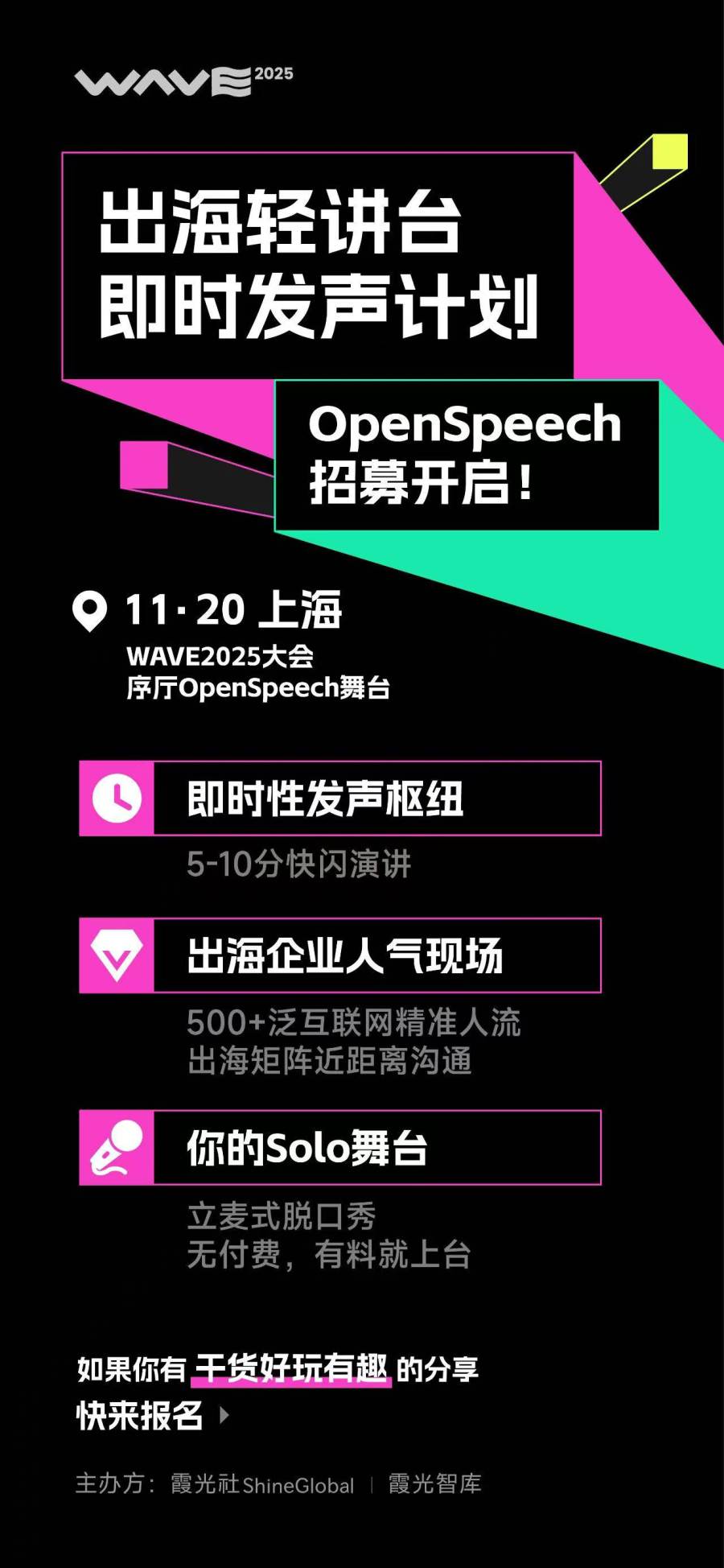 11 月 20 日,无限变量・编码新未来|WAVE2025泛互联网全球领航者大会即将在上海启幕。作为大会序厅特别策划的互动环节,“出海轻讲台・即时发声计划”OpenSpeech 现已正式开启报名,所有希望分享经验、交流见解的出海从业者都有机会登上舞台。