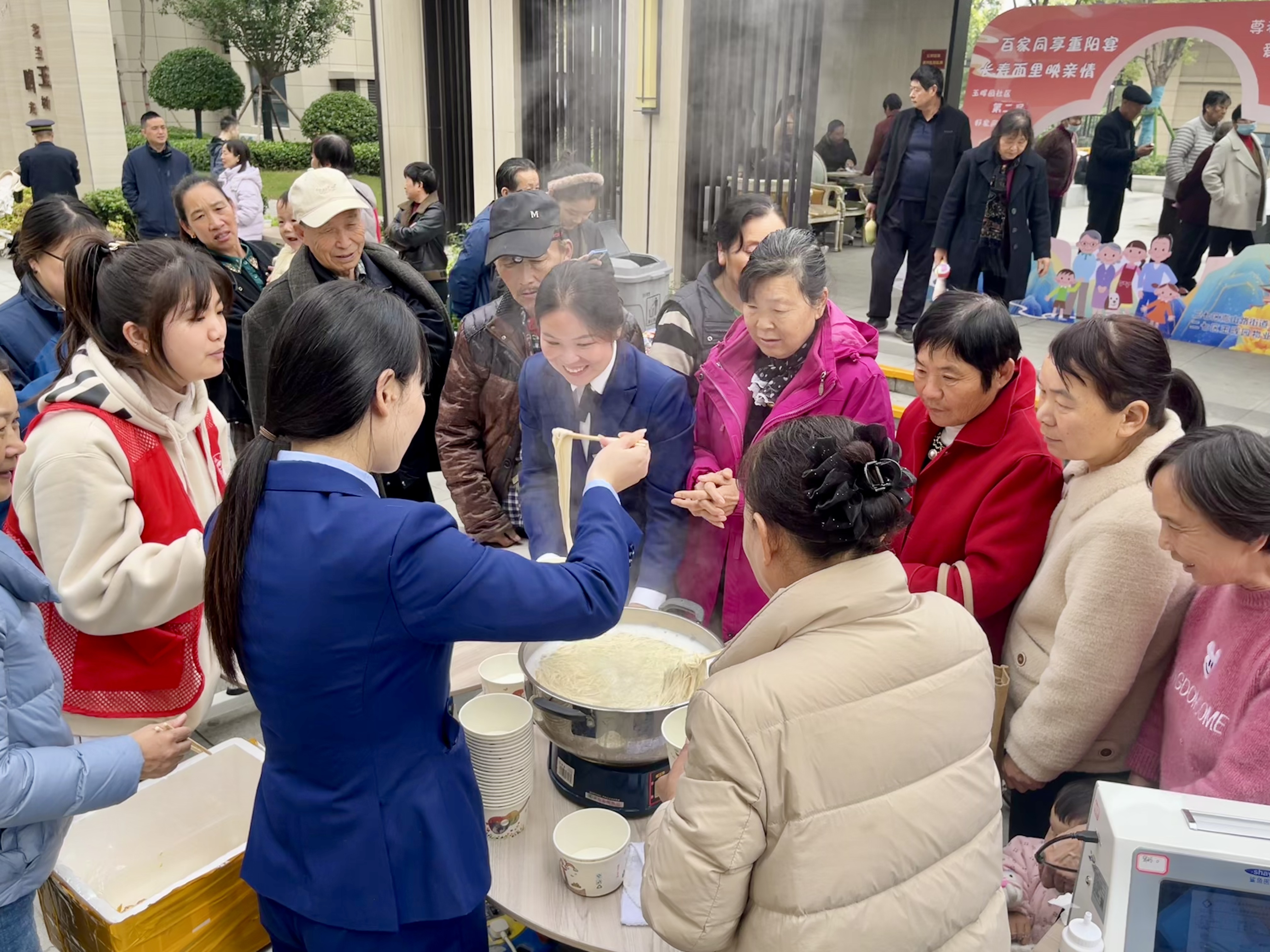 另一边,工作人员和志愿者早早架起锅灶,现场煮起“长寿面”,热气腾腾的面条搭配鸡蛋,传递着真挚祝福。他们还为独居老人上门送面,让老人足不出户感受节日氛围。同时,孩子们将亲手制作的重阳糕发放给老人,心意与香甜交融,暖透人心。