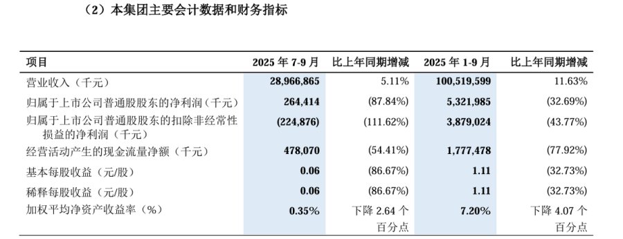 前三季度,营收为1005.2亿元,同比增长11.63%,归属于上市公司普通股股东的净利润为53.22亿元,同比下降32.69%。