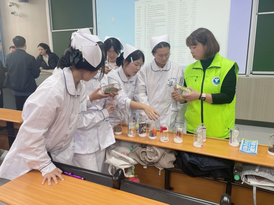 在互动体验区,禁毒社工带来的毒品仿真模型吸引了同学们层层围观。“这支看似普通的电子烟,实则添加了大麻油;这块‘水果软糖’含有合成大麻素,误食后可能成瘾。”禁毒社工们耐心讲解,同学们则轮流拿起模型仔细端详,亲身感受毒品伪装术的隐蔽性。针对护理专业特点,现场还特别展示了常见麻精药品的样本与包装,详细说明了其合法使用范围与滥用后果,帮助未来医护工作者提前筑牢职业防线。