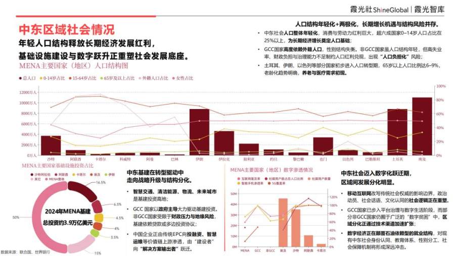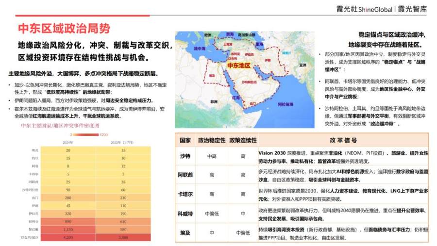 与此同时,区域地缘风险仍在持续演化,政治稳定性差异、财政结构分化与人口年轻化并存,使中东成为全球经济版图中风险最高、潜力亦最大的地区之一。