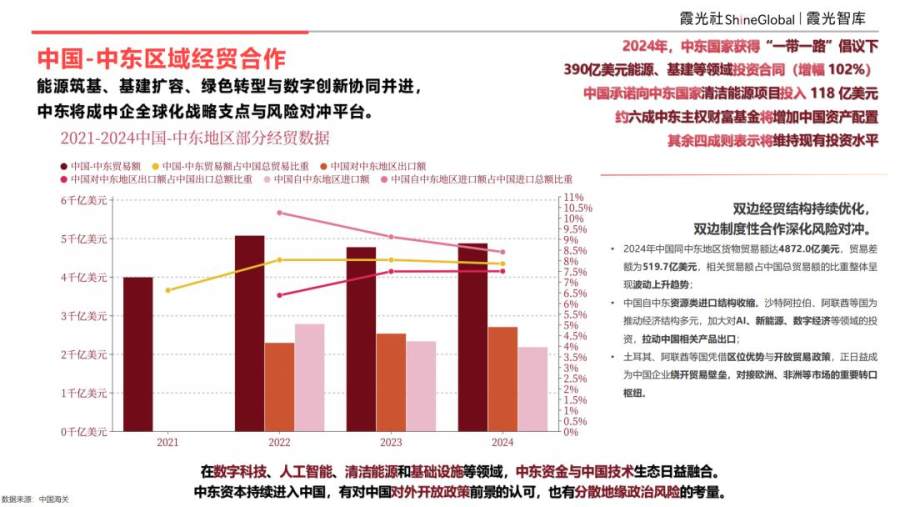 2024年中国与中东贸易额接近4900亿美元,呈现资源贸易额下降、高新产品贸易额上升的结构优化趋势。GCC国家通过主权基金与数字转型战略,逐步成为中国企业的投资与合作高地。双方经贸关系已阶段转向深度互联阶段。