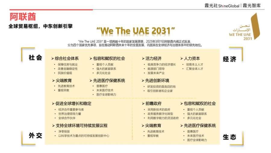 “We The UAE 2031”愿景展现了阿联酋谋求“全面领先”的雄心,不仅限于经济,更涵盖了社会包容、前瞻政府、全球外交和绿色可持续发展,旨在巩固其全球领导者而不仅是区域领导者的地位。政策体系强调“全球连接+人才开放”,政府运用前瞻性治理推动教育、医疗、社会保障数字化升级。