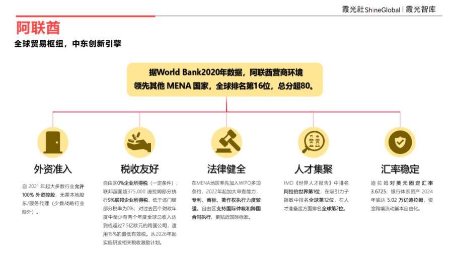阿联酋的核心竞争力在于其“自由、稳定、便利”的营商环境,实行高度开放的投资制度,自2021年起大多数行业允许100%外资控股,跨境资金流动基本自由化。税收友好、法律健全、资金自由流动、人才聚集等要素为企业的长期稳定经营提供了制度保障。