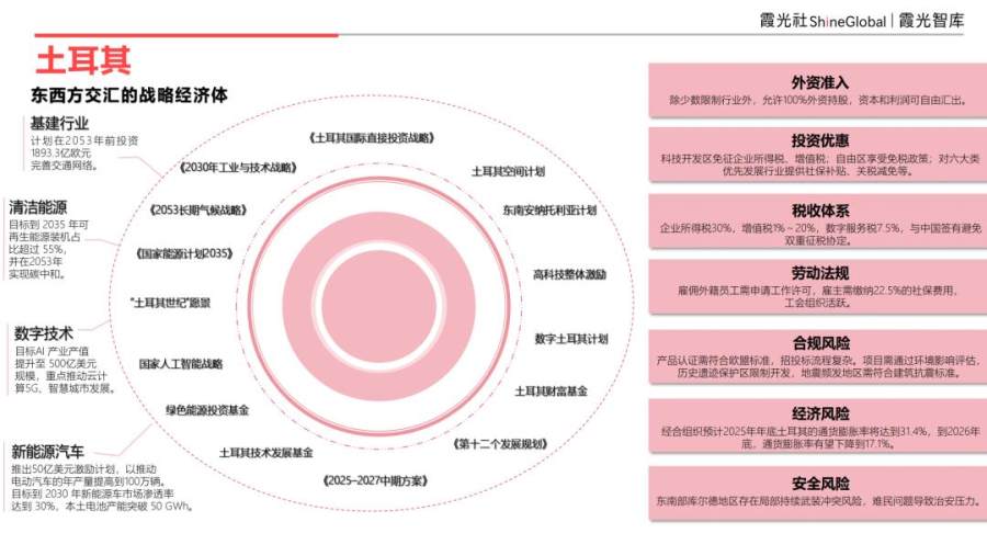 土耳其通过系统的国家战略推动产业升级,以外资优惠政策吸引资金与技术,并在交通、可再生能源、AI与制造业领域持续加码投资。中企出海土耳其要注意通胀与安全风险。