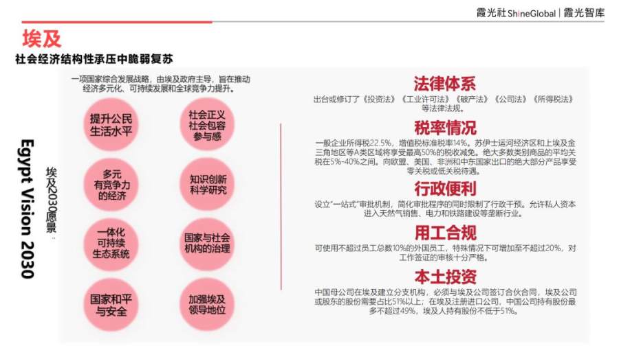埃及社会经济结构性承压中脆弱复苏,政府正通过立法和设立特区等方式努力改善投资环境。