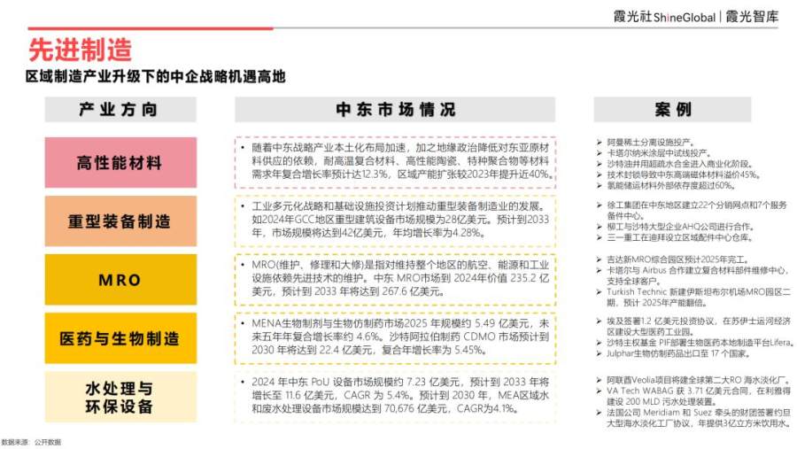 先进制造业被视为推动中东经济多元化的关键引擎。各国通过产业集群、自由区和特区政策吸引全球制造企业,强化供应链安全与就业增长。中东各国正大力推动先进制造业的本土化布局。区域制造业正从“进口替代”向“本地创新”演进,产业政策普遍要求本地含量与知识转移,为中国出海企业提供了从本地扎根的战略机遇。