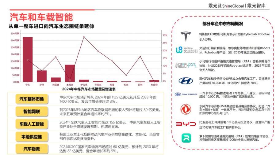 汽车产业在中东从消费市场走向制造基地布局,电动化与智能化浪潮推动各国布局本地生产。随着电池与车联网基础设施逐步完善,中东正形成从整车制造到车载智能的完整生态。沙特、阿联酋和土耳其均发布相关测试法规,为国际企业提供政策窗口。Robotaxi、无人巴士与智慧交通系统逐步落地,带动了传感器、芯片与软件系统需求扩张。