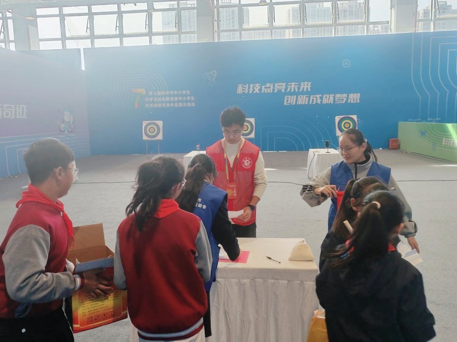 在活动现场,志愿者们各司其职,以高度的专注和严谨的态度投入工作,在各个岗位点亮志愿星火。在评比现场,他们穿梭于各展台之间,认真细致地向评委老师报送参赛作品的成绩,并迅速准确地完成分数统计,保障了比赛评比的公平和高效。此外志愿者们还主动化身“科学助教”,耐心解答着小选手们的疑问,协助他们调试了运用光学、力学、机械传动等原理的科技作品。志愿者们用热情的服务播撒科学的种子,用温暖的陪伴守护童真的笑脸,让科普教育在互动体验中焕发出新的活力。