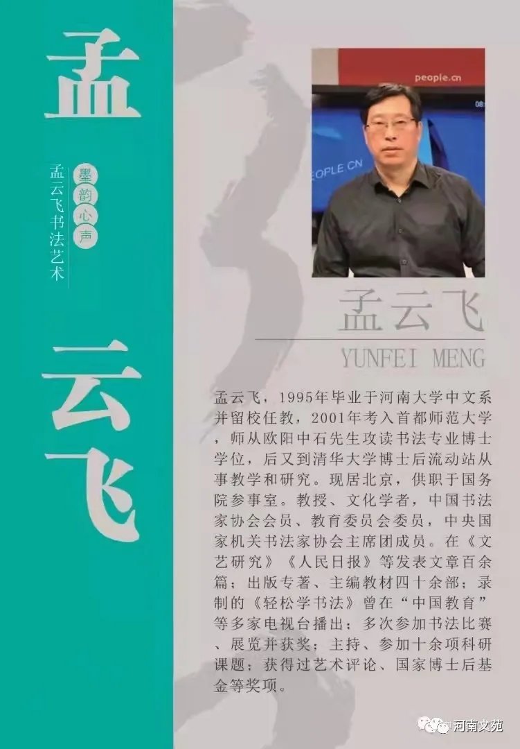 孟云飞,1995年毕业于河南大学中文系并留校任教,2001年考入首都师范大学师从欧阳中石先生攻读书法专业博士学位,2007年到清华大学艺术学博士后流动站从事教学和研究。曾任《中华书画家》学术部主任、副总编、中国书法家协会教育委员会委员、中央国家机关书法家协会主席团成员等。教授职称,现供职于国务院参事室,并兼任河南大学、上海交通大学、泰国格乐大学的硕士与博士研究生导师。在《文艺研究》《中国文艺评论》《中国书法》《光明日报》《人民日报》等报刊发表论文150余篇。