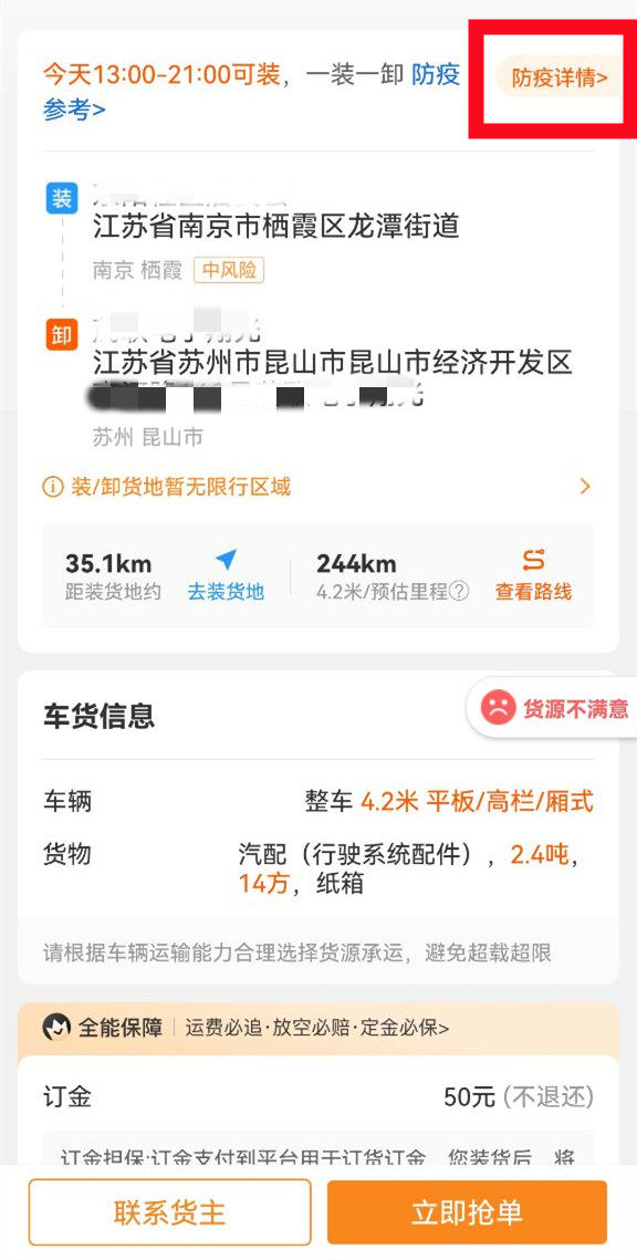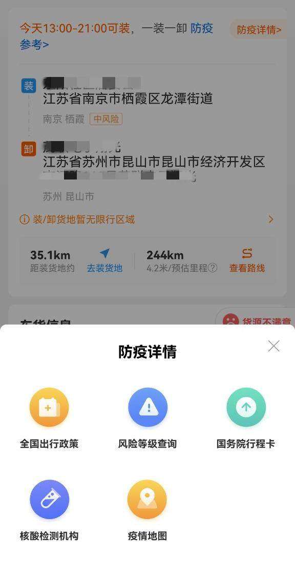 据悉,早在今年年初,针对各地疫情的反复,满帮集团就已经在司机app的货源详情页推出“防疫参考”功能,让司机随时查询装卸地的防疫政策,在接单前了解当地的防疫要求,提前做好准备,保障物资的顺利运输。