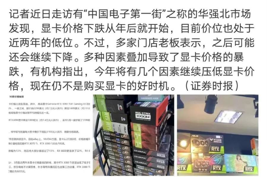“降价明显,店家称还会继续降。” 近日,有媒体走访有 “中国电子第一街” 之称的华强北市场,发现显卡价格从年后就开始下跌。3 月 25 日,#显卡报价雪崩#的话题也频频登上热搜。