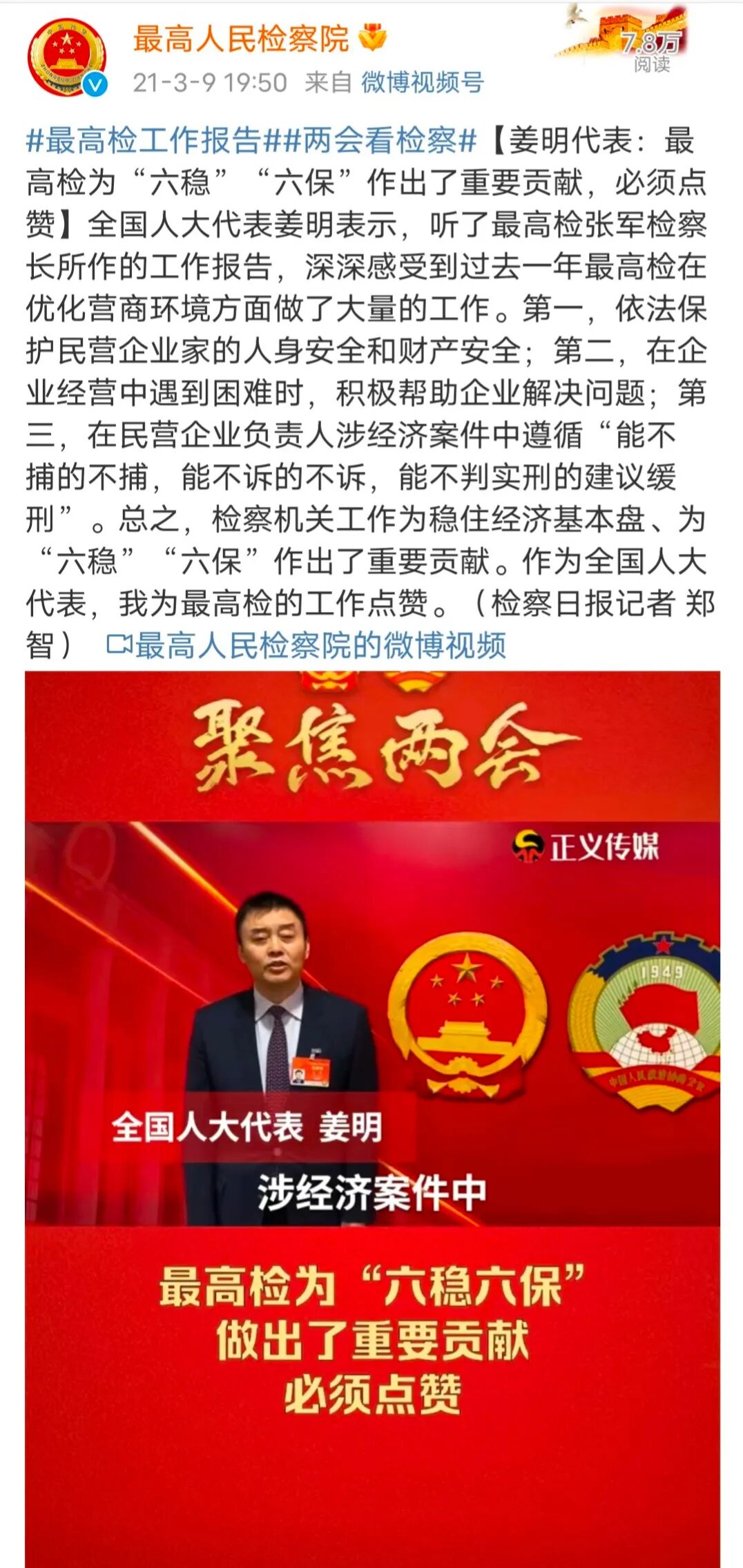 2022年3月10日,最高检发函感谢姜明代表在审议最高检工作报告时提出的:以司法促进提升社会治理能力和治理体系,进一步建立和完善冤假错案防范制度体系等宝贵意见。