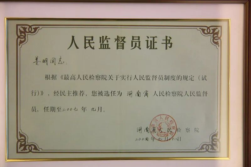 2004年9月,姜明有幸被聘为河南省人民检察院第一批人民监督员。