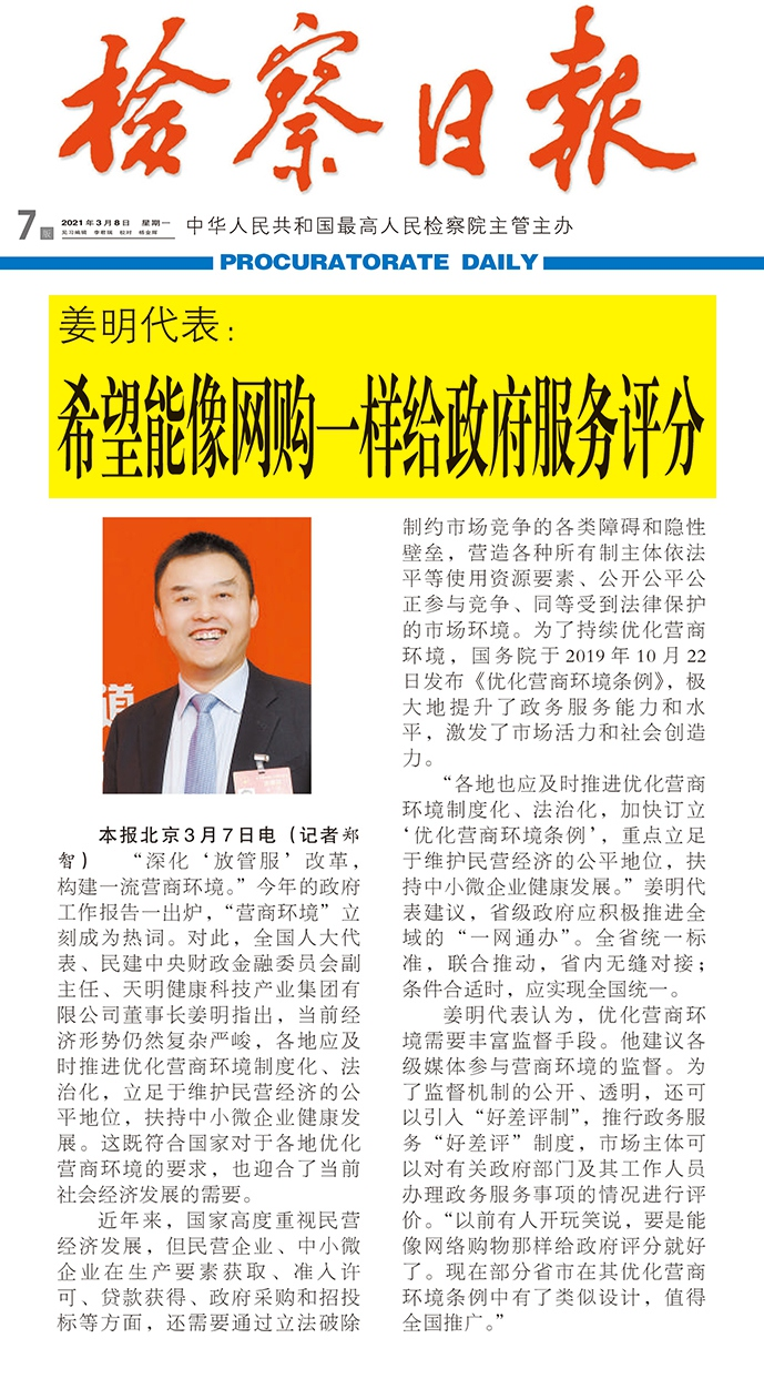 2018年11月20日,姜明代表参加张军检察长与高云龙主席、徐乐江书记在全国工商联联合召开的“检察机关服务保障民营经济发展调研座谈会”并发言,得到张军检察长和高云龙主席的肯定。