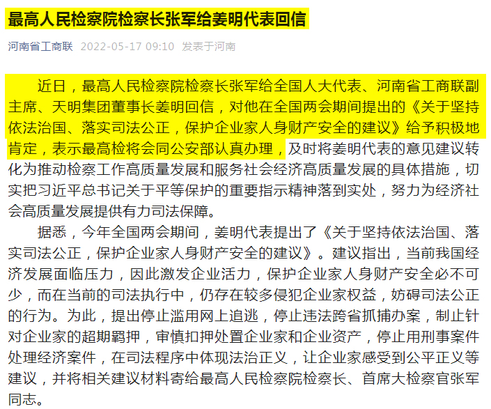 2022年5月5日,张军检察长亲自给姜明代表回函说:“这些年来,您作为一名优秀企业家代表和全国人大代表,最高检特约监督员,对检察工作提出许多真知灼见,给予我们有力的支持、监督和帮助。对您提出的《关于坚持依法治国落实司法公正保护企业家人身财产安全的建议》我们正在与公安部一起认真办理。”让姜明代表倍加感动,更加敬仰张军检察长。